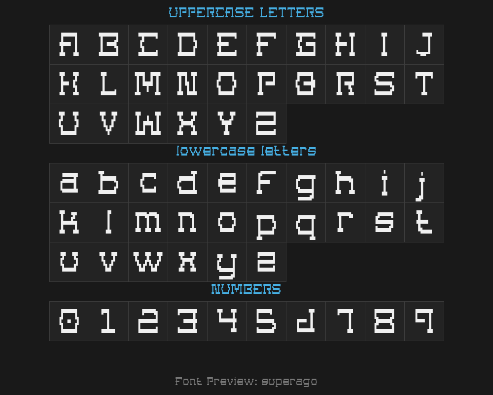 superago is a font file with a size of 0.06 MB. The full font name is Superago, Version 1.0; 2002; initial release version. It contains 218 characters, supports 8 Chinese characters. The copyright belongs to Superago. superago font is available for free download, but commercial use requires confirmation on the Superago official website whether it's free for commercial use.
