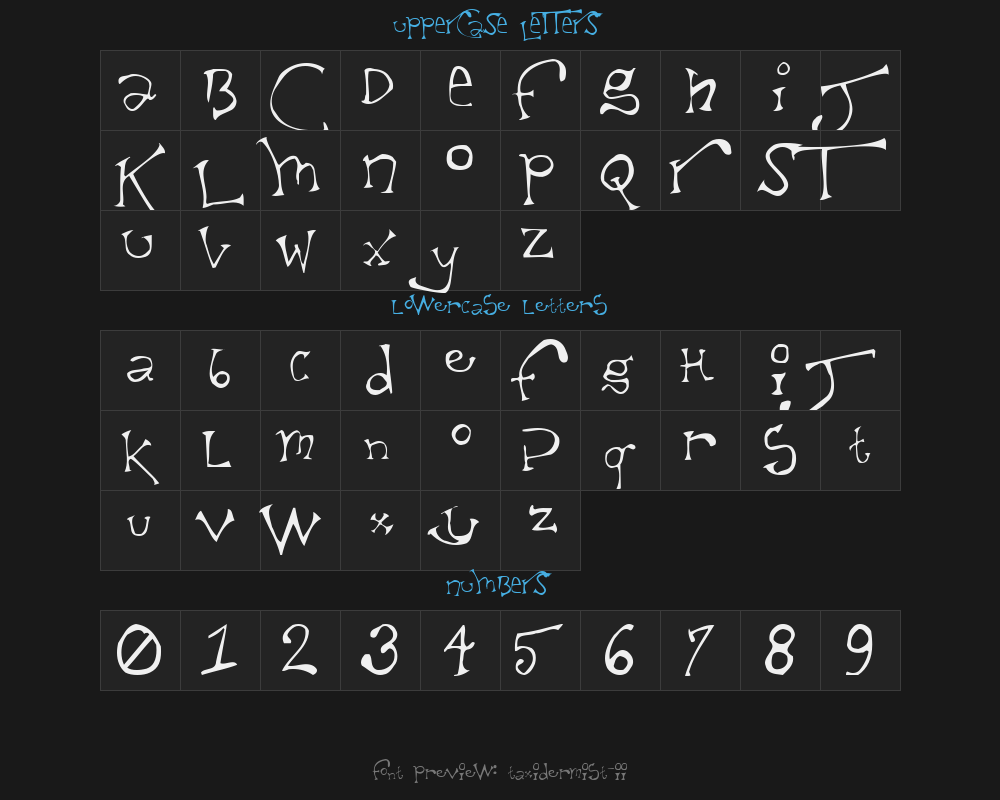 taxidermist-ii is a font file with a size of 0.03 MB. The full font name is Taxidermist II, Macromedia Fontographer 4.1 11 16 97 version. It contains 103 characters, supports 8 Chinese characters. The copyright belongs to Taxidermist II. taxidermist-ii font is available for free download, but commercial use requires confirmation on the Taxidermist II official website whether it's free for commercial use.