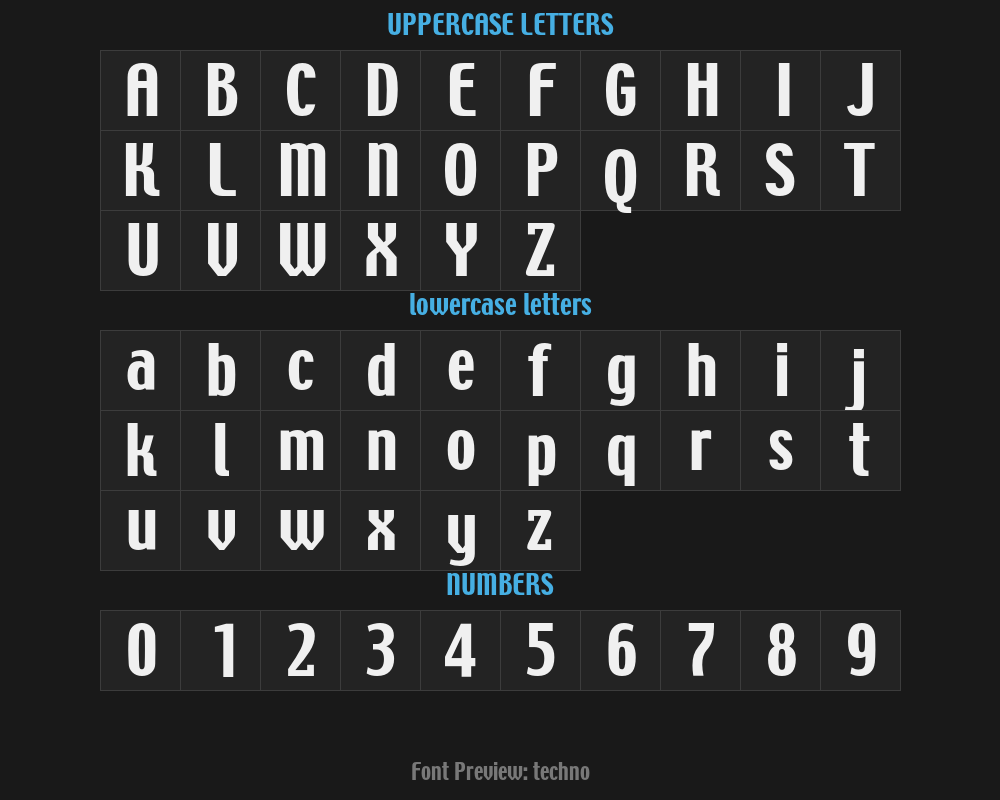 techno is a font file with a size of 0.07 MB. The full font name is Techno, 001.000 version. It contains 401 characters, supports 8 Chinese characters. The copyright belongs to Techno. techno font is available for free download, but commercial use requires confirmation on the Techno official website whether it's free for commercial use.