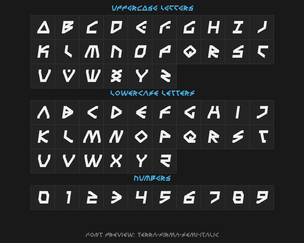 terra-firma-semi-italic is a font file with a size of 0.03 MB. The full font name is Terra Firma Semi-Italic, Version 3.0; 2016 version. It contains 219 characters, supports 8 Chinese characters. The copyright belongs to Terra Firma Semi-Italic. terra-firma-semi-italic font is available for free download, but commercial use requires confirmation on the Terra Firma Semi-Italic official website whether it's free for commercial use.