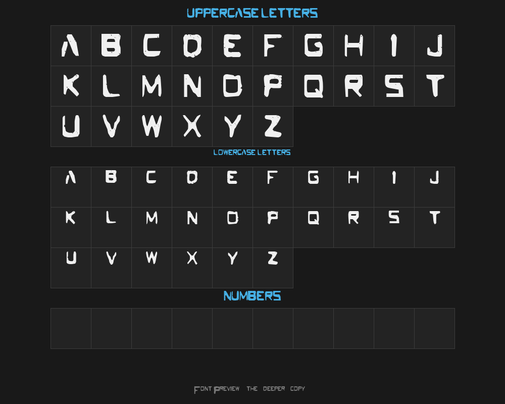 the-deeper-copy-1- is a font file with a size of 0.05 MB. The full font name is the DEEPER, Version 2.000 version. It contains 60 characters, supports 8 Chinese characters. The copyright belongs to theDEEPER. the-deeper-copy-1- font is available for free download, but commercial use requires confirmation on the theDEEPER official website whether it's free for commercial use.