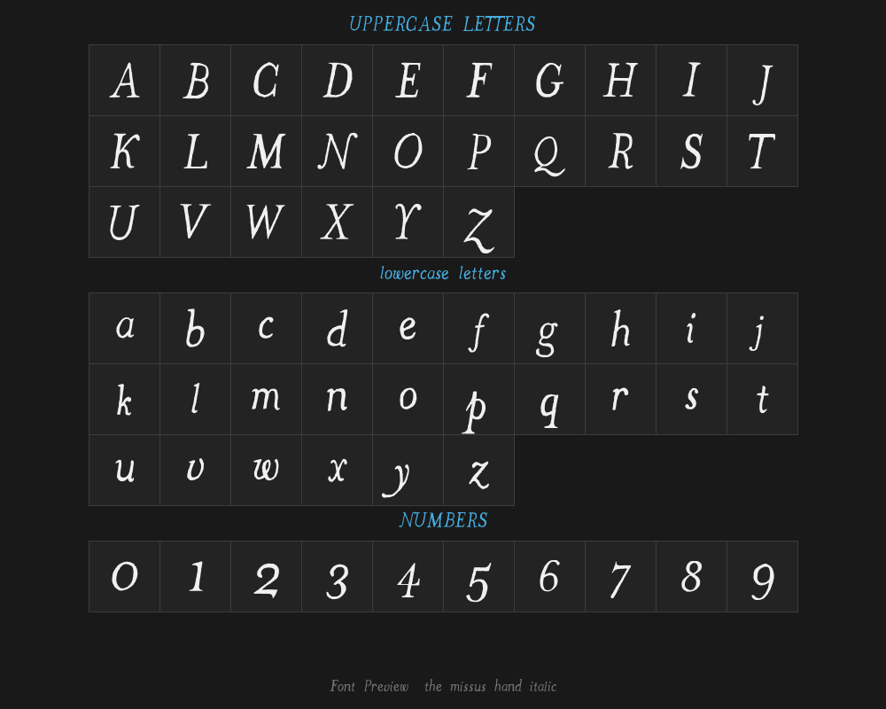the-missus-hand-italic is a font file with a size of 0.05 MB. The full font name is The Missus Hand Italic, 1.0 version. It contains 70 characters, supports 8 Chinese characters. The copyright belongs to The Missus Hand. the-missus-hand-italic font is available for free download, but commercial use requires confirmation on the The Missus Hand official website whether it's free for commercial use.
