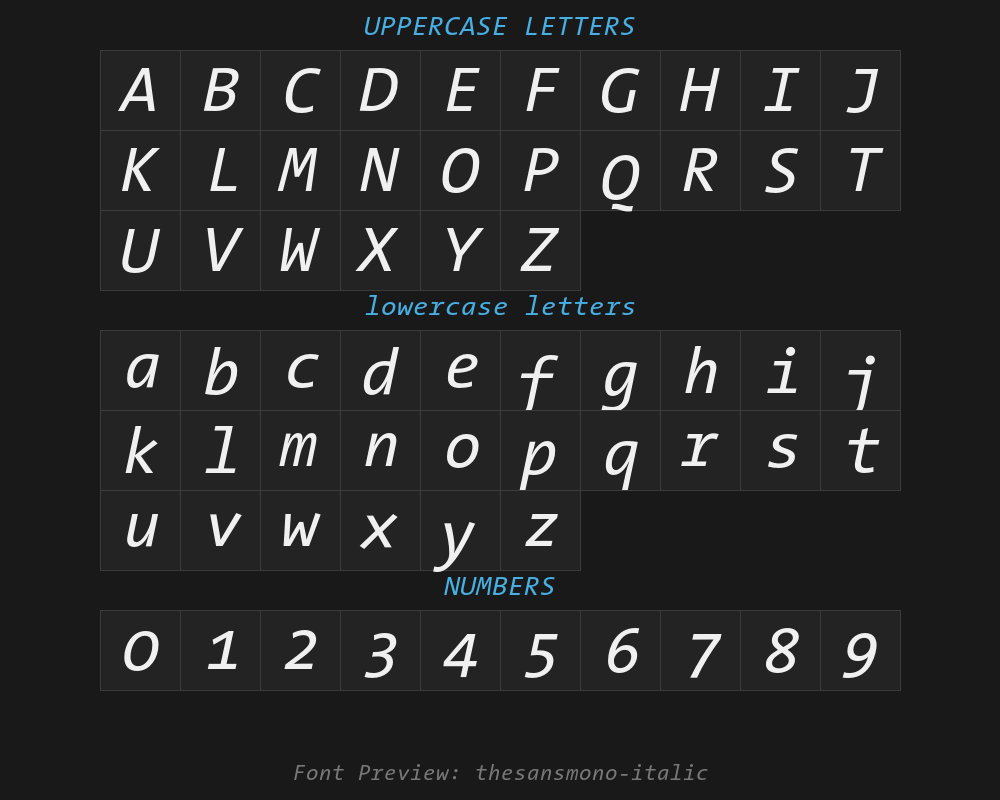 thesansmono-italic is a font file with a size of 0.03 MB. The full font name is TheSansMono-Italic, 001.000 version. It contains 244 characters, supports 8 Chinese characters. The copyright belongs to The Sans Mono-. thesansmono-italic font is available for free download, but commercial use requires confirmation on the The Sans Mono- official website whether it's free for commercial use.