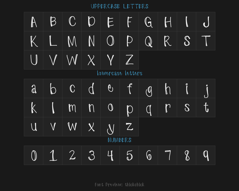 thickchick is a font file with a size of 0.05 MB. The full font name is ThickChick, Version 1.0 version. It contains 84 characters, supports 8 Chinese characters. The copyright belongs to ThickChick. thickchick font is available for free download, but commercial use requires confirmation on the ThickChick official website whether it's free for commercial use.
