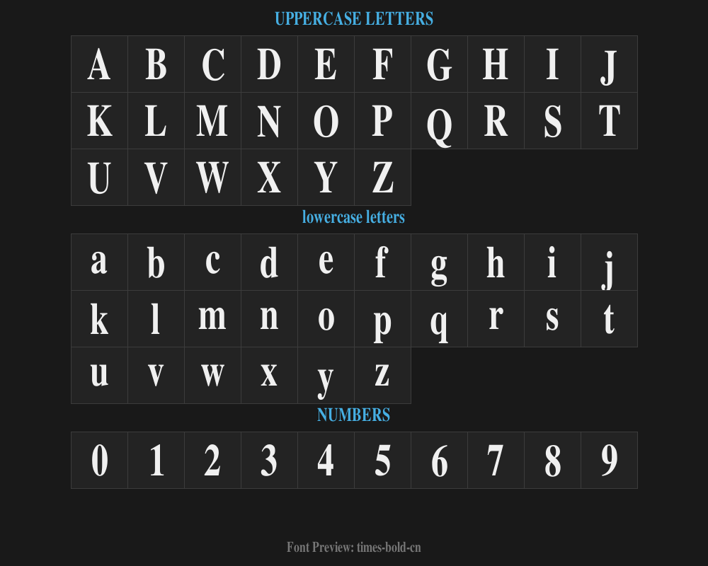 times-bold-cn is a font file with a size of 0.09 MB. The full font name is Times-Bold Cn, 1.0 version. It contains 394 characters, supports 8 Chinese characters. The copyright belongs to Times-Bold Cn. times-bold-cn font is available for free download, but commercial use requires confirmation on the Times-Bold Cn official website whether it's free for commercial use.