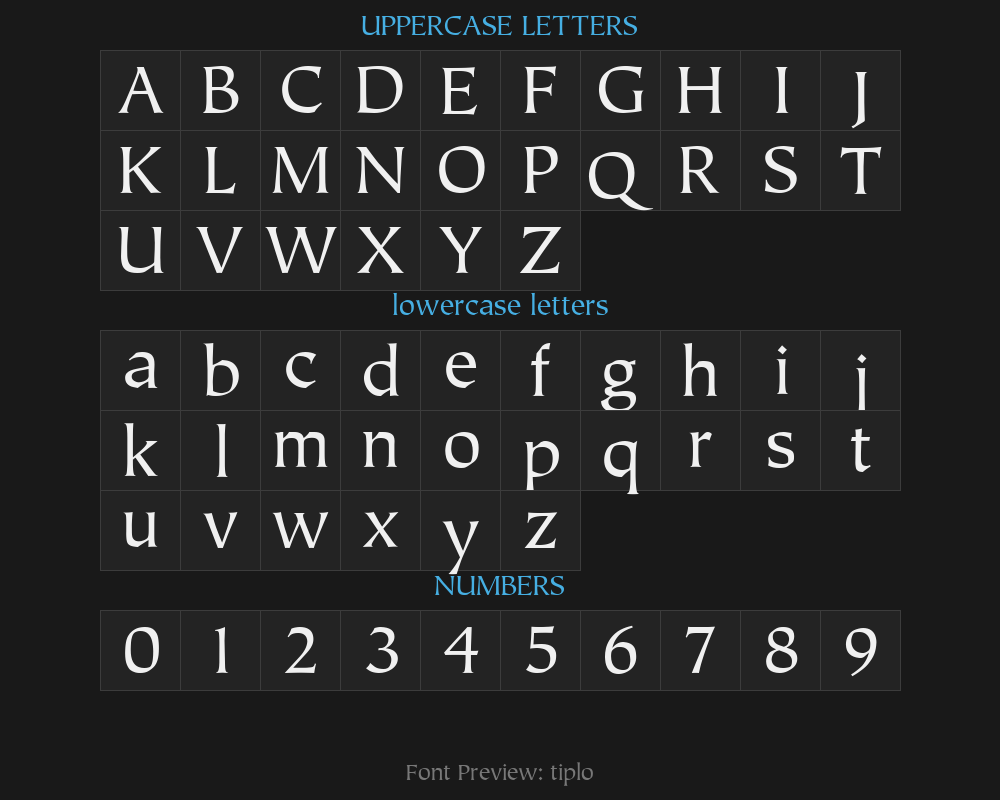 tiplo is a font file with a size of 0.02 MB. The full font name is Tiplo, 1.0 version. It contains 95 characters, supports 8 Chinese characters. The copyright belongs to Tiplo. tiplo font is available for free download, but commercial use requires confirmation on the Tiplo official website whether it's free for commercial use.