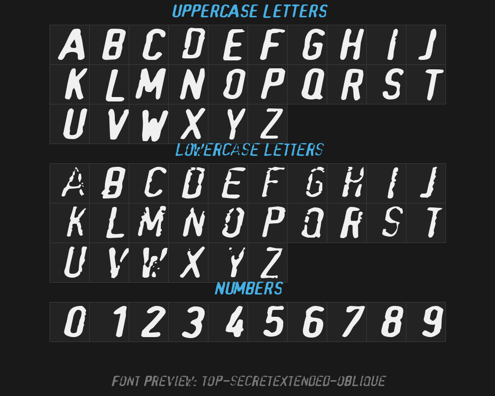 top-secretextended-oblique is a font file with a size of 0.07 MB. The full font name is Top SecretExtended Oblique, Rev. 003.000 version. It contains 216 characters, supports 8 Chinese characters. The copyright belongs to Top SecretExtended. top-secretextended-oblique font is available for free download, but commercial use requires confirmation on the Top SecretExtended official website whether it's free for commercial use.