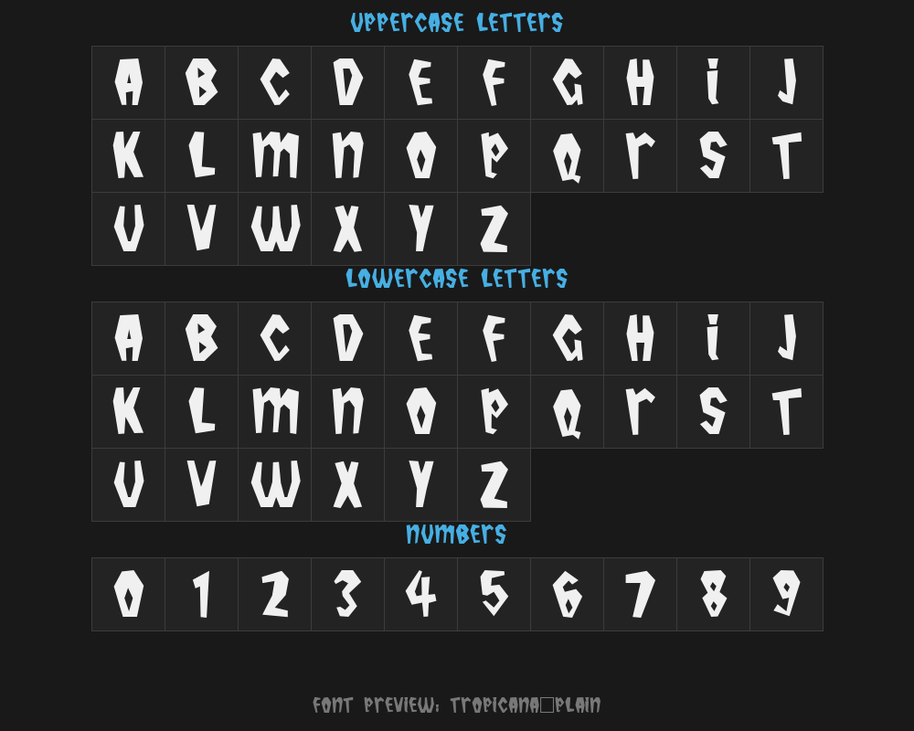 tropicana-plain is a font file with a size of 0.01 MB. The full font name is Tropicana Plain, Altsys Fontographer 3.3 5 13 94 version. It contains 82 characters, supports 8 Chinese characters. The copyright belongs to Tropicana. tropicana-plain font is available for free download, but commercial use requires confirmation on the Tropicana official website whether it's free for commercial use.