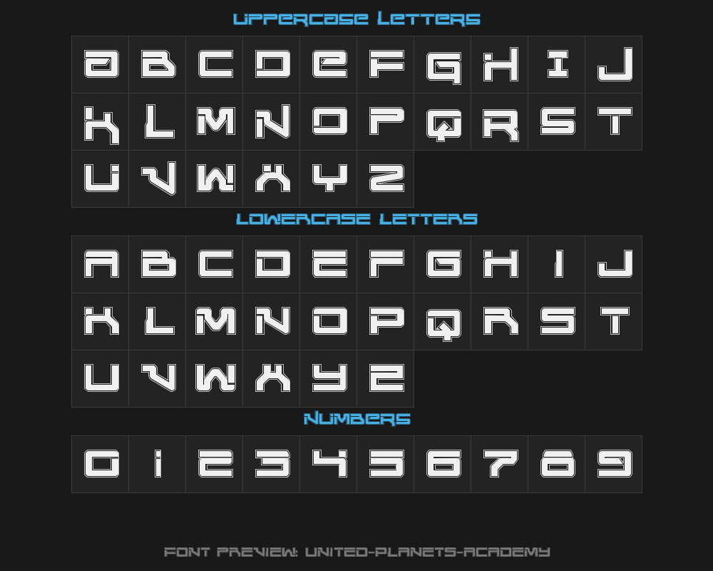 united-planets-academy is a font file with a size of 0.08 MB. The full font name is United Planets Academy, Version 1.0; 2013 version. It contains 222 characters, supports 8 Chinese characters. The copyright belongs to United Planets Academy. united-planets-academy font is available for free download, but commercial use requires confirmation on the United Planets Academy official website whether it's free for commercial use.
