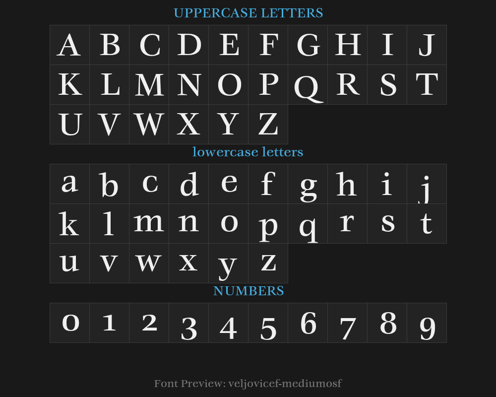 veljovicef-mediumosf is a font file with a size of 0.03 MB. The full font name is VeljovicEF-MediumOsF, 001.000 version. It contains 223 characters, supports 8 Chinese characters. The copyright belongs to VeljovicEF OsF. veljovicef-mediumosf font is available for free download, but commercial use requires confirmation on the VeljovicEF OsF official website whether it's free for commercial use.