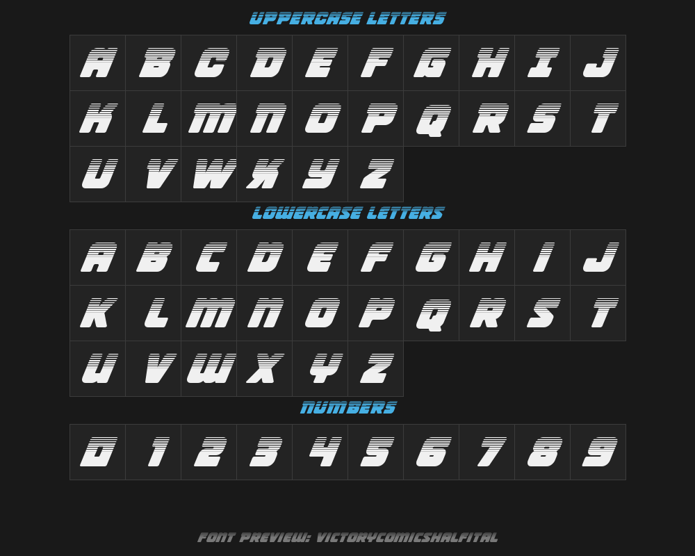 victorycomicshalfital is a font file with a size of 0.07 MB. The full font name is Victory Comics Halftone Italic, Version 1.0; 2017 version. It contains 219 characters, supports 8 Chinese characters. The copyright belongs to Victory Comics Halftone Italic. victorycomicshalfital font is available for free download, but commercial use requires confirmation on the Victory Comics Halftone Italic official website whether it's free for commercial use.