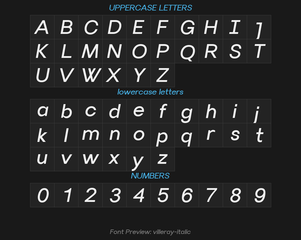 villeray-italic is a font file with a size of 0.27 MB. The full font name is Villeray Italic, Version 1.100; ttfautohint (v1.5) version. It contains 908 characters, supports 8 Chinese characters. The copyright belongs to Villeray. villeray-italic font is available for free download, but commercial use requires confirmation on the Villeray official website whether it's free for commercial use.