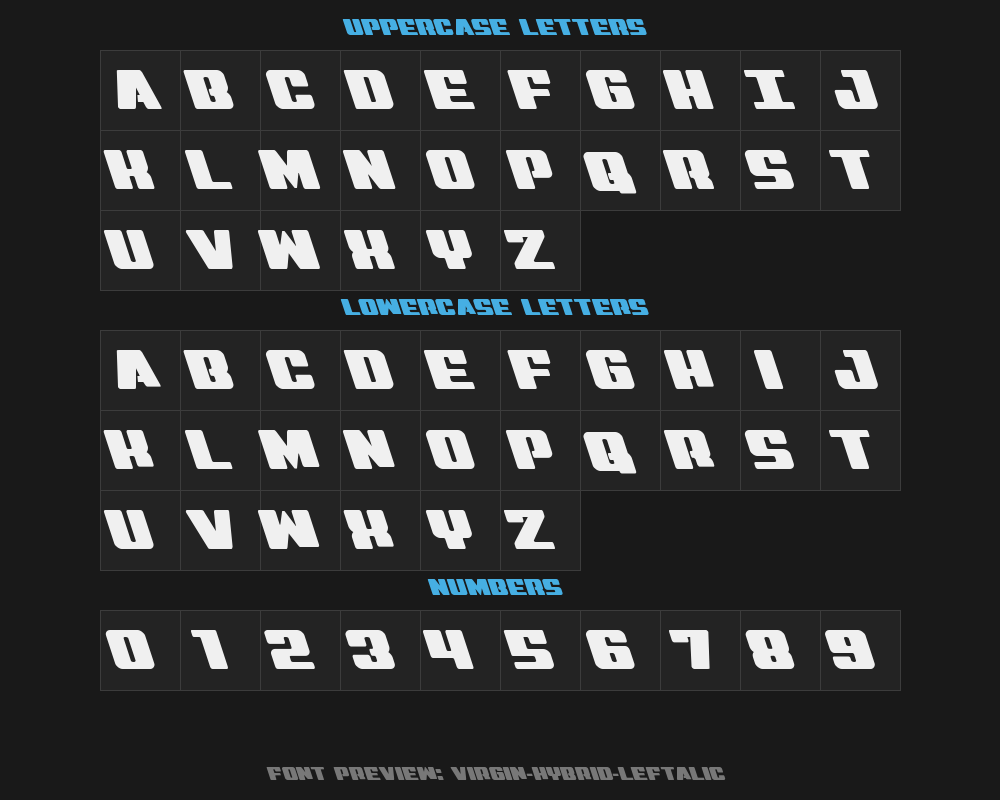 virgin-hybrid-leftalic is a font file with a size of 0.04 MB. The full font name is Virgin Hybrid Leftalic, Version 1.0; 2014 version. It contains 222 characters, supports 8 Chinese characters. The copyright belongs to Virgin Hybrid Leftalic. virgin-hybrid-leftalic font is available for free download, but commercial use requires confirmation on the Virgin Hybrid Leftalic official website whether it's free for commercial use.