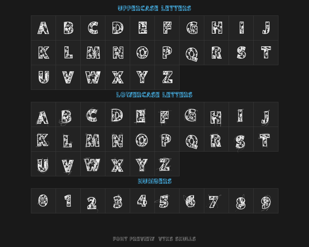 vtks-skulls is a font file with a size of 0.29 MB. The full font name is VTKS SKULLS, Version 1.00 December 13, 2008, initial release version. It contains 656 characters, supports 8 Chinese characters. The copyright belongs to VTKS SKULLS. vtks-skulls font is available for free download, but commercial use requires confirmation on the VTKS SKULLS official website whether it's free for commercial use.