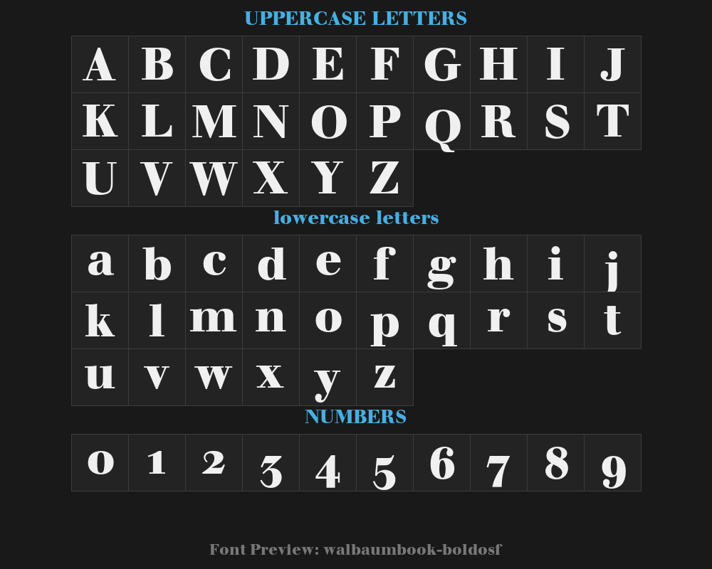 walbaumbook-boldosf is a font file with a size of 0.03 MB. The full font name is WalbaumBook-BoldOsF, OTF 1.0;PS 001.001;Core 1.0.22 version. It contains 235 characters, supports 8 Chinese characters. The copyright belongs to Walbaum Book BoldOsF. walbaumbook-boldosf font is available for free download, but commercial use requires confirmation on the Walbaum Book BoldOsF official website whether it's free for commercial use.