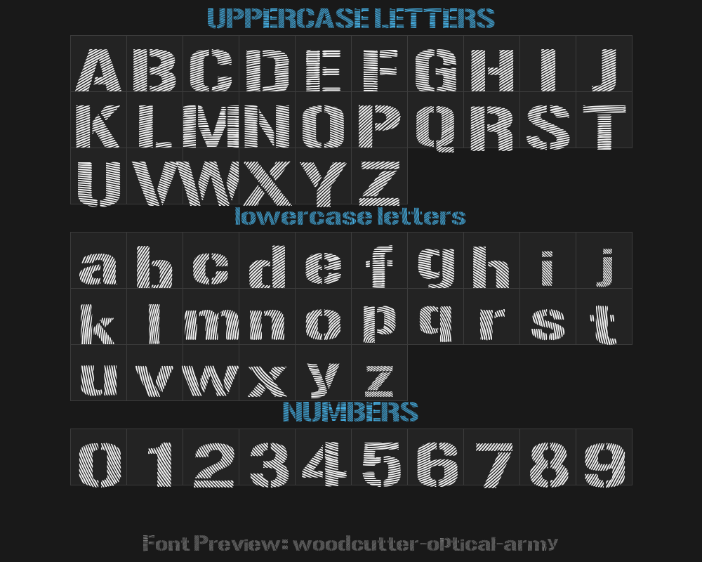 woodcutter-optical-army is a font file with a size of 0.38 MB. The full font name is Woodcutter Optical Army, Version 1.00 December 7, 2013, initial release version. It contains 240 characters, supports 8 Chinese characters. The copyright belongs to Woodcutter Optical Army. woodcutter-optical-army font is available for free download, but commercial use requires confirmation on the Woodcutter Optical Army official website whether it's free for commercial use.