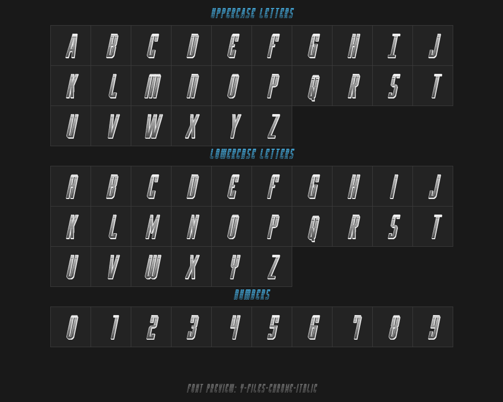 y-files-chrome-italic is a font file with a size of 0.17 MB. The full font name is Y-Files Chrome Italic, Version 1.0; 2016 version. It contains 219 characters, supports 8 Chinese characters. The copyright belongs to Y-Files Chrome Italic. y-files-chrome-italic font is available for free download, but commercial use requires confirmation on the Y-Files Chrome Italic official website whether it's free for commercial use.