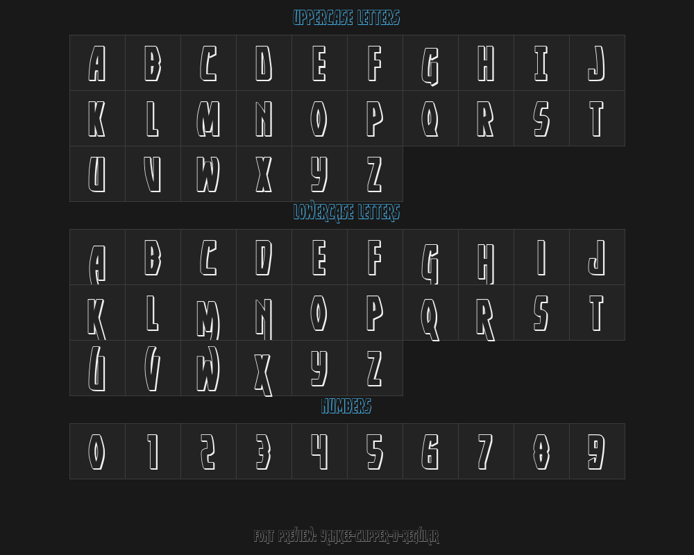 yankee-clipper-3d-regular is a font file with a size of 0.09 MB. The full font name is Yankee Clipper 3D Regular, 001.000 version. It contains 216 characters, supports 8 Chinese characters. The copyright belongs to Yankee Clipper 3D. yankee-clipper-3d-regular font is available for free download, but commercial use requires confirmation on the Yankee Clipper 3D official website whether it's free for commercial use.