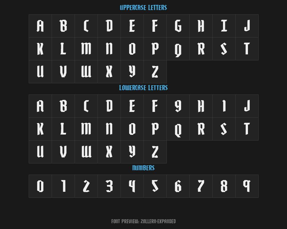 zollern-expanded is a font file with a size of 0.06 MB. The full font name is Zollern Expanded, Version 1.0; 2012 version. It contains 219 characters, supports 8 Chinese characters. The copyright belongs to Zollern Expanded. zollern-expanded font is available for free download, but commercial use requires confirmation on the Zollern Expanded official website whether it's free for commercial use.