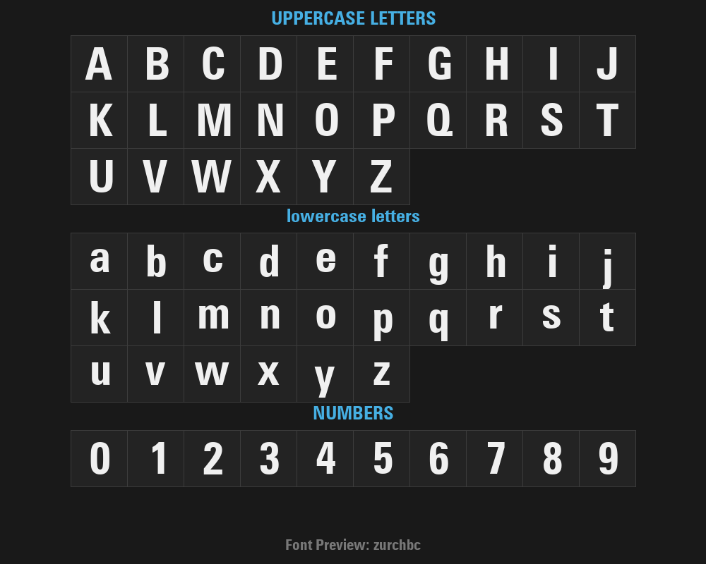 zurchbc is a font file with a size of 0.04 MB. The full font name is Zurich Bold Condensed BT, mfgpctt-v1.52 Thursday, January 14, 1993 10 21 50 am (EST) version. It contains 257 characters, supports 8 Chinese characters. The copyright belongs to Zurich Cn BT. zurchbc font is available for free download, but commercial use requires confirmation on the Zurich Cn BT official website whether it's free for commercial use.